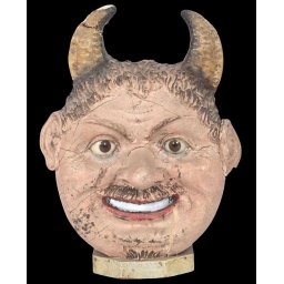 Exceptionnelle tête de diable avec cornes en carton pressé, yeux et bouche en verre, intérieur avec bougie pour éclairage et illumination des yeux et de la bouche.
