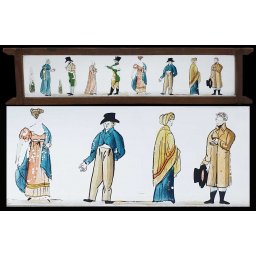 Superbe plaque de lanterne magique fin XVIII ème début XIX ème représentant 4 couples de bourgeois. 45.5 x 10.2 cm