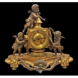 Un angelots regarde dans la boite optique, le second tient le rideau et le troisième est assis près de la cheminée.