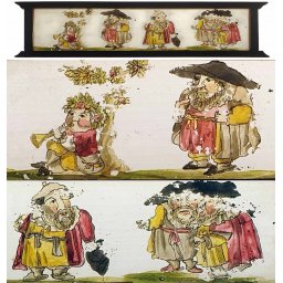 Superbe plaque de lanterne magique fin XVIII ème représentant 4 barbus et un enfant jouant de la flûte. 40 x 9 cm