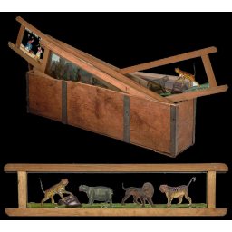 Boite de 10 plaques de lanterne magique fin XVIII ème début XIX ème d'origine Hollandaise ou Allemande. Sujets divers : animaux - jeux d'enfants - militaires - métiers - scènes de genre etc.... Monture en bois typique de l'époque, 44 cm de longueur
