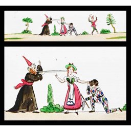 Plaque peinte à la main, représentant un magicien diseur de bonne aventure avec Arlequin et un fou dansant, vers 1830 - 1835.