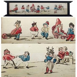 Superbe plaque de lanterne magique fin XVIII ème représentant différents personnages caricaturaux. 41.5 x 9.5 cm