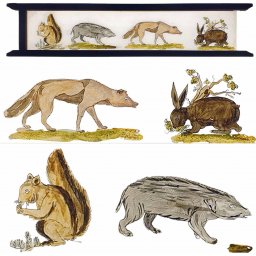 3 plaques peintes à la main avec des couleurs ocre et noire, typiques de cette époque.