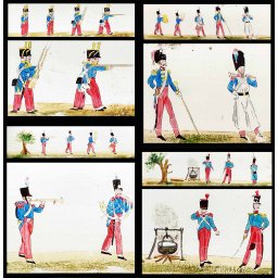 Ensemble de 4 plaques peintes à la main, représentant des soldats et des musiciens de l'armée de Louis-Philippe ou Charles X vers 1830 - 1835.