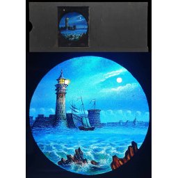 Très curieuse plaque animée peinte à la main. Elle est entièrement en verre, le disque tournant ainsi que la monture vers 1850.