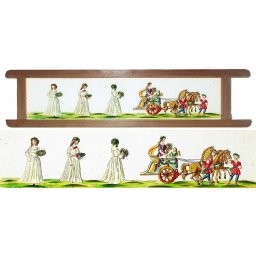 Plaque de lanterne magique vers 1830 - 1840 d'origine allemande. Peinture très fine. 28.5 x 13.5 cm. Système à tirette en carton