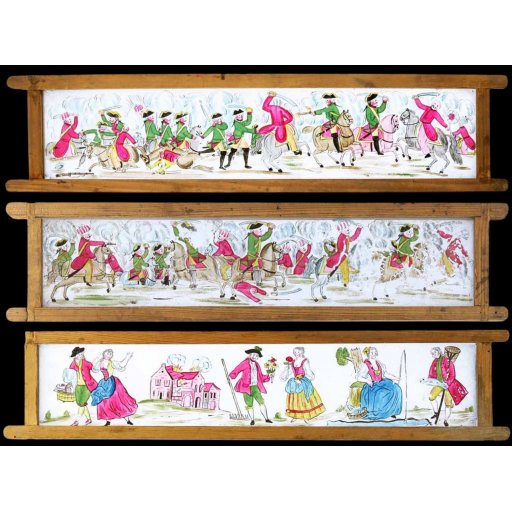 Exceptionnelle série de 14 plaques XVIII ème dont certaines animées, accompagnant la lanterne magique de colporteur d'origine Hollandaise présentée dans la rubrique " Lanterne magique 1750 - 1830 " ( LM 98 )