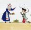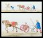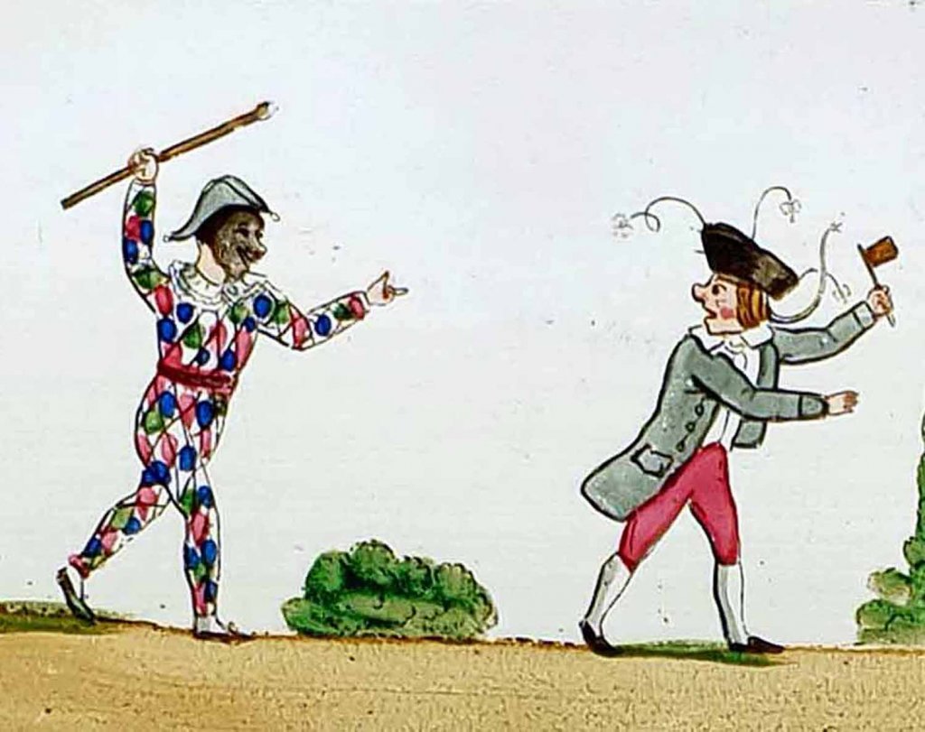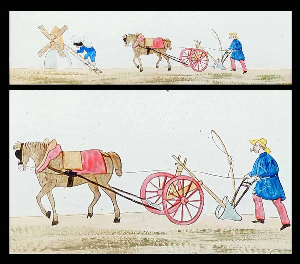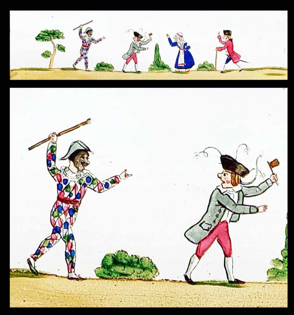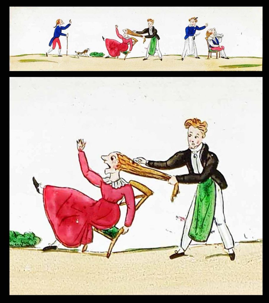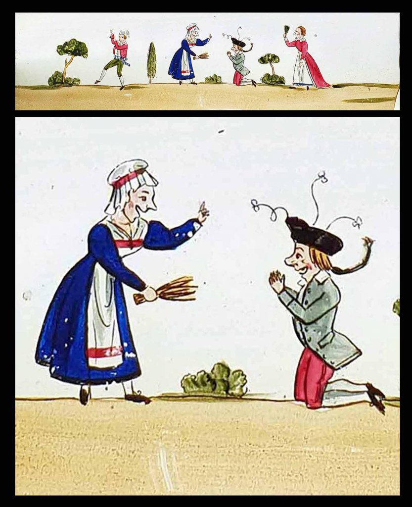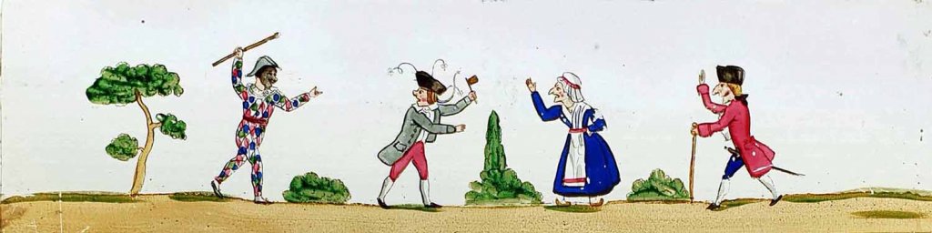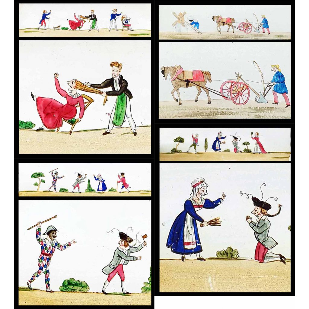 Ensemble de 4 plaques peintes à la main, représentant sujets : barbier, coiffeur, paysan et meunier, Arlequin etc... vers 1830 - 1835.