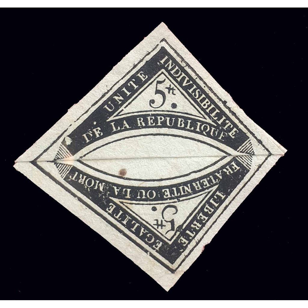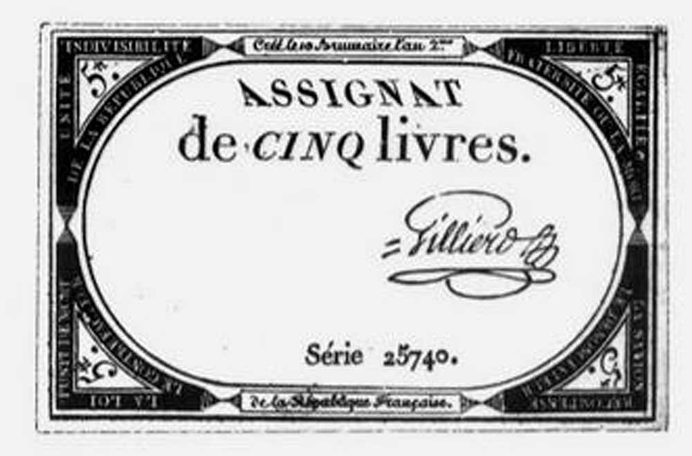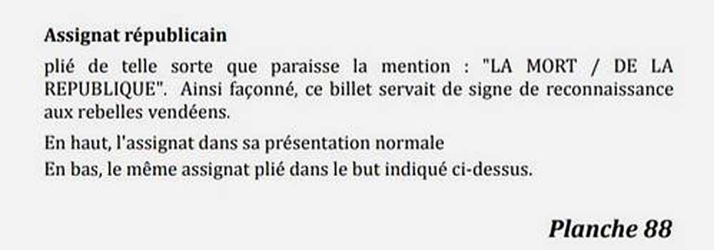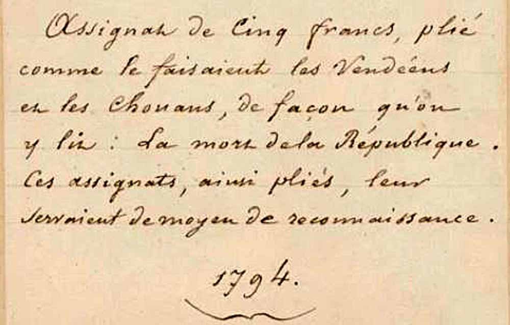 Assignat républicain de cinq livres du 10 Brumaire An IIème- plié comme le faisaient les Vendéens et les Chouans, de telle façon qu'on y lisait : "La mort de la république".