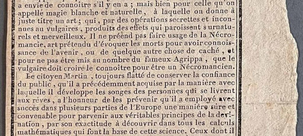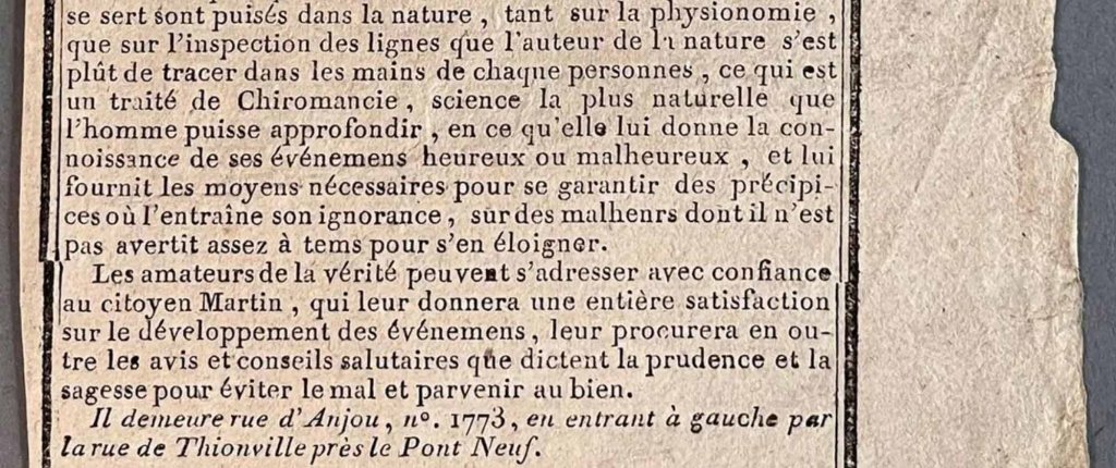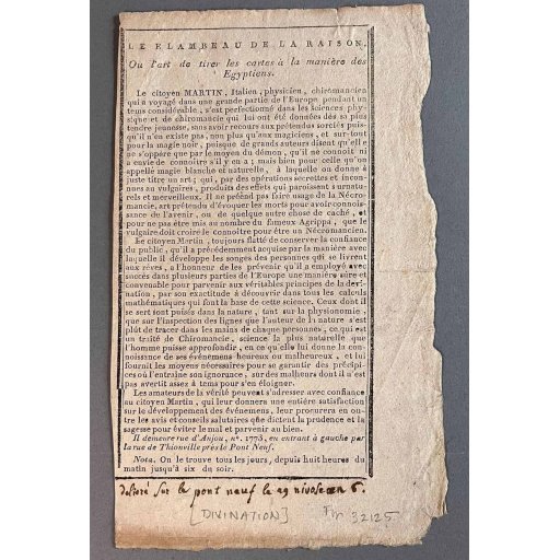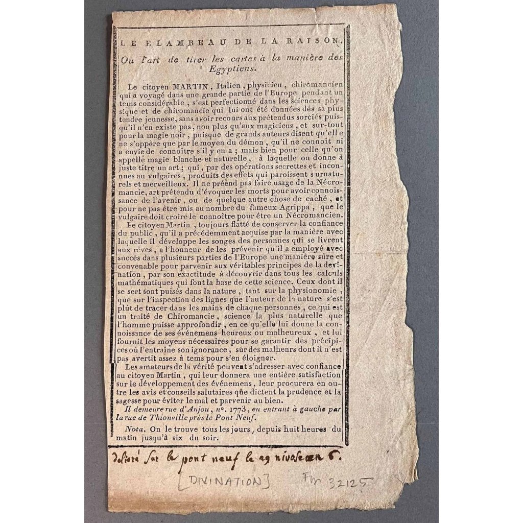 Rare prospectus in-8 vantant les mérites du citoyen Martin, Italien, physicien, chiromancien.