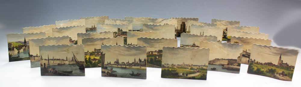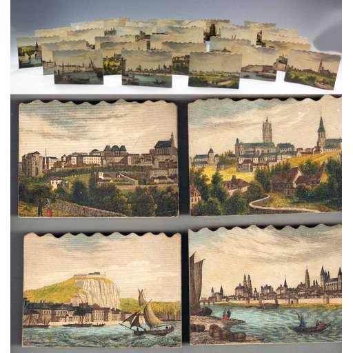 Jeu vers 1830 composé de 28 vues d'optique aquarellées et collées sur des support de bois de 9.5 x 7 cm.