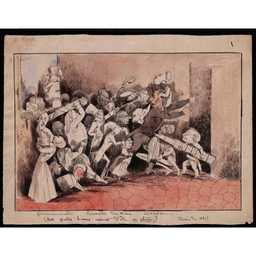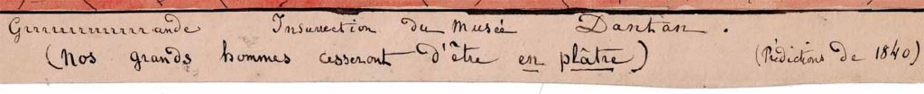Il est titré : Grrrrrrrrande insurrection du musée Dantan ( nos grands hommes cesseront d'être en plâtre. ) ( prédiction de 1840 )