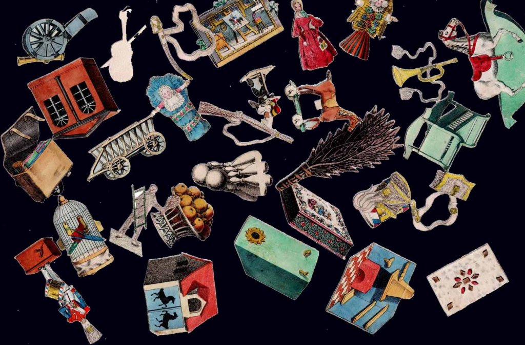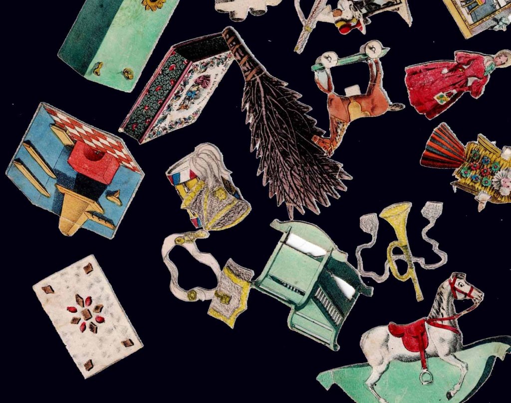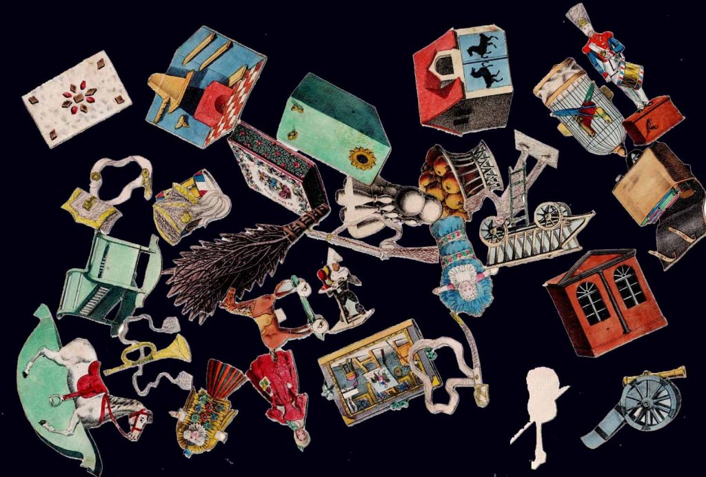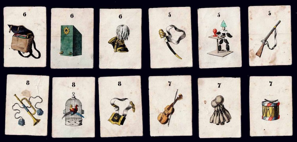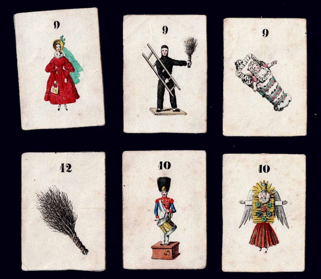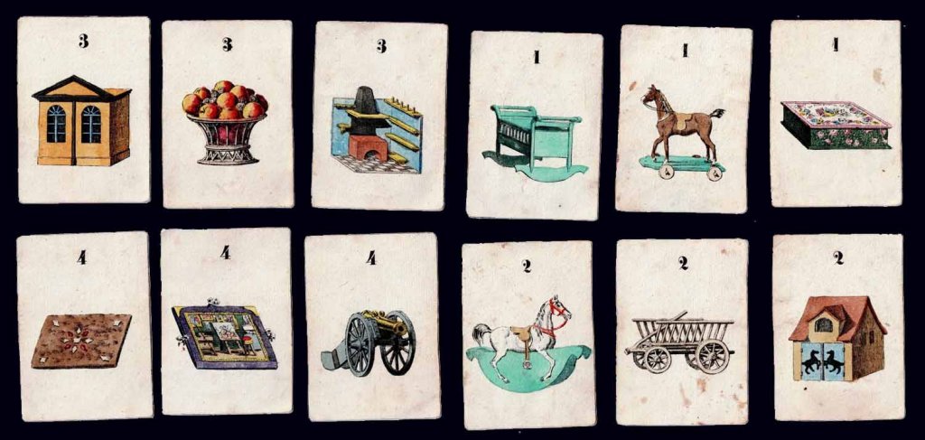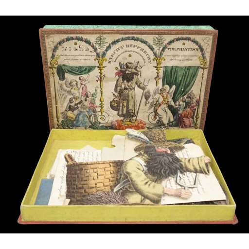 Rare jeu romantique d'origine allemande vers 1830. Les cartes et découpis représentent de nombreux jeux, jouets et objets divers dont une boite optique très représentative de l'époque. 24.5 x 17.5 x 2.5 cm