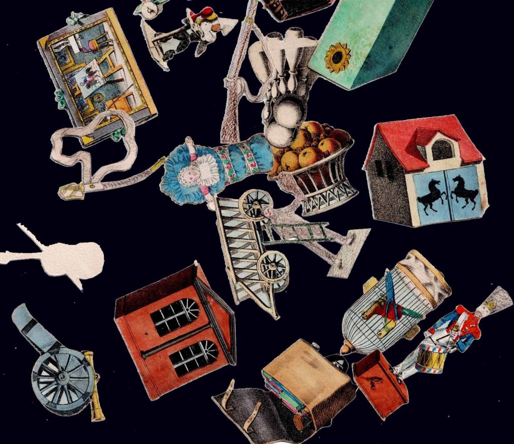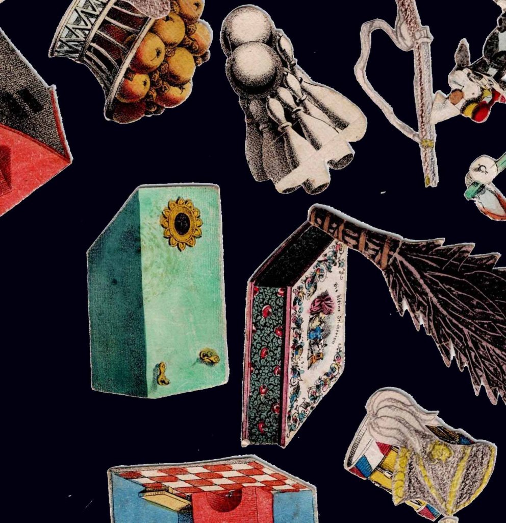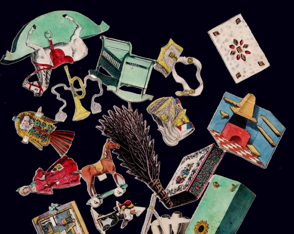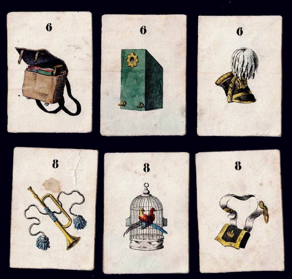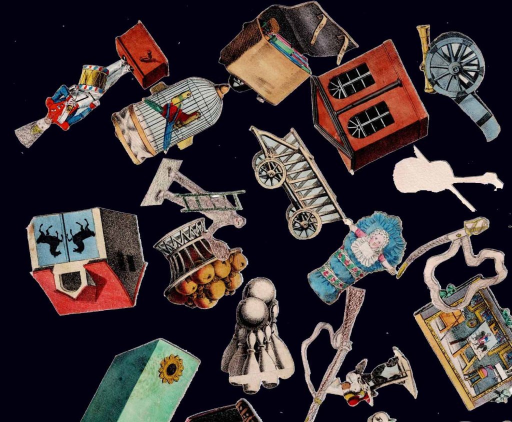 Rare jeu romantique d'origine allemande vers 1830. Les cartes et découpis représentent de nombreux jeux, jouets et objets divers dont une boite optique très représentative de l'époque. 24.5 x 17.5 x 2.5 cm