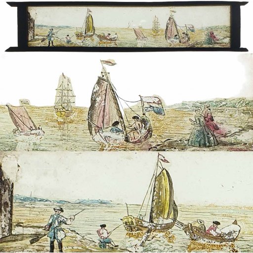 Superbe plaque de lanterne magique fin XVIII ème représentant une scène de marine. 41 x 8.5 cm