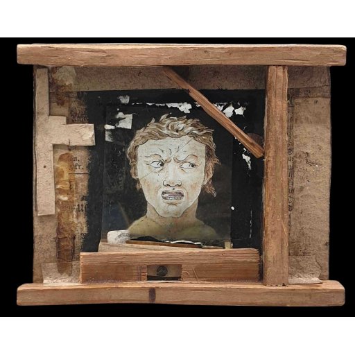Montée sur carton, bois et papier cette tête d'homme vous suit du regard et bouge la langue. 11.4 x 13.8 cm