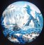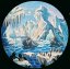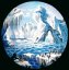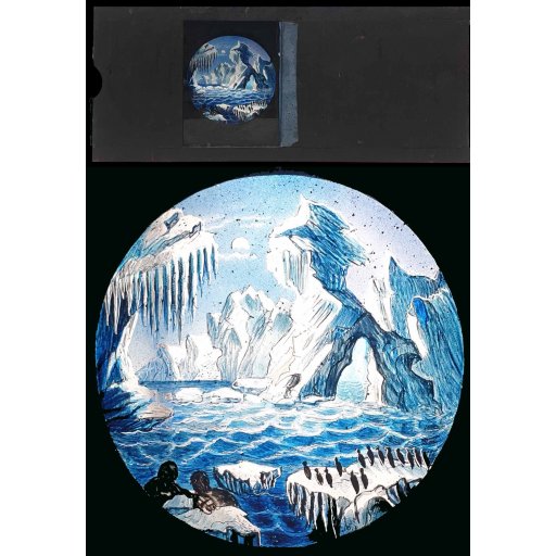 Un bateau à vapeur passe devant des icebergs. Titrée VOYAGE DU CAPITAINE ROSS - PÔLE ARCTIQUE
